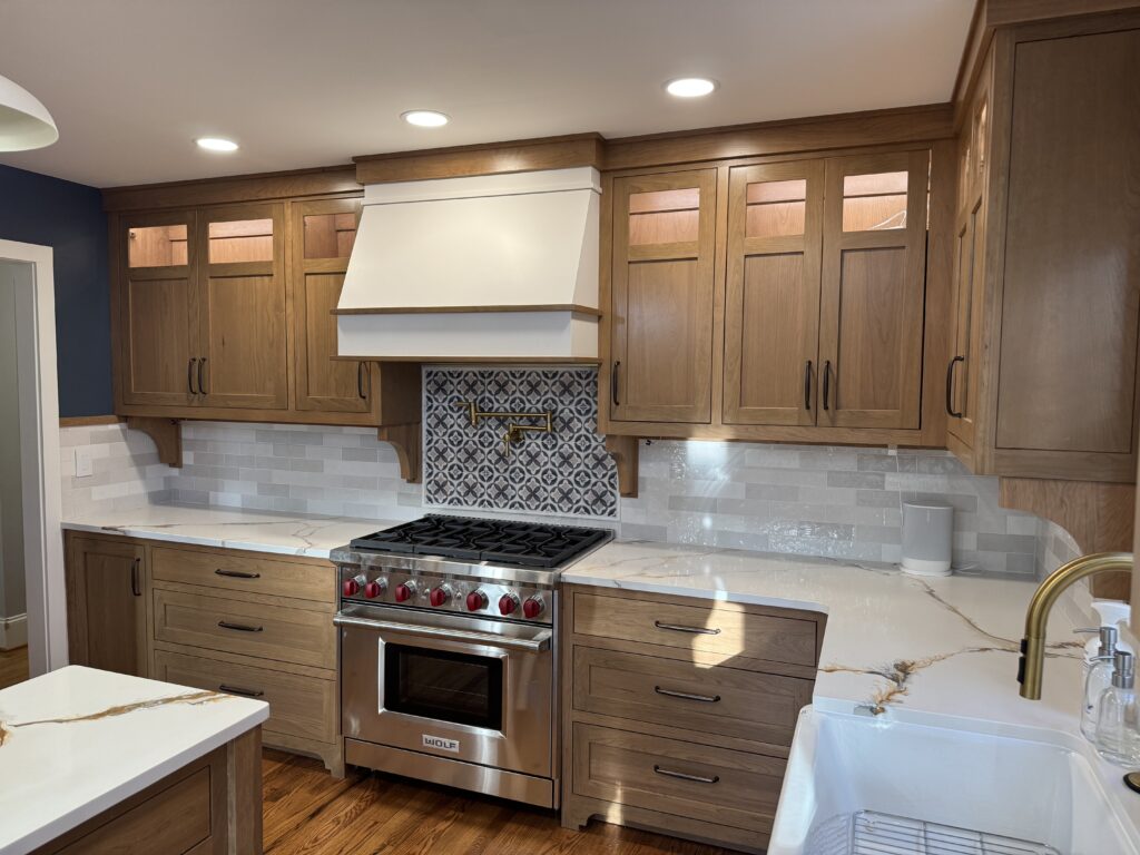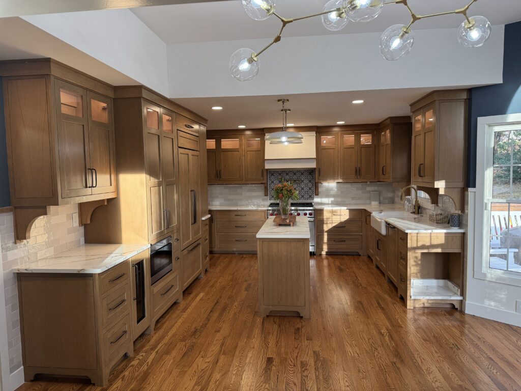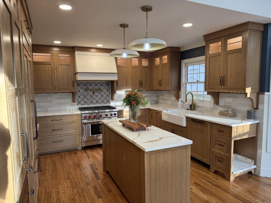 The finished kitchen is a harmonious blend of farmhouse warmth and Craftsman detail. The custom cherry cabinets elevate the space with rich texture and timeless presence, while the chef-driven layout ensures the room functions at a professional level. The clients now have a kitchen that supports their passion for cooking and reflects their personal style with authenticity and elegance.
